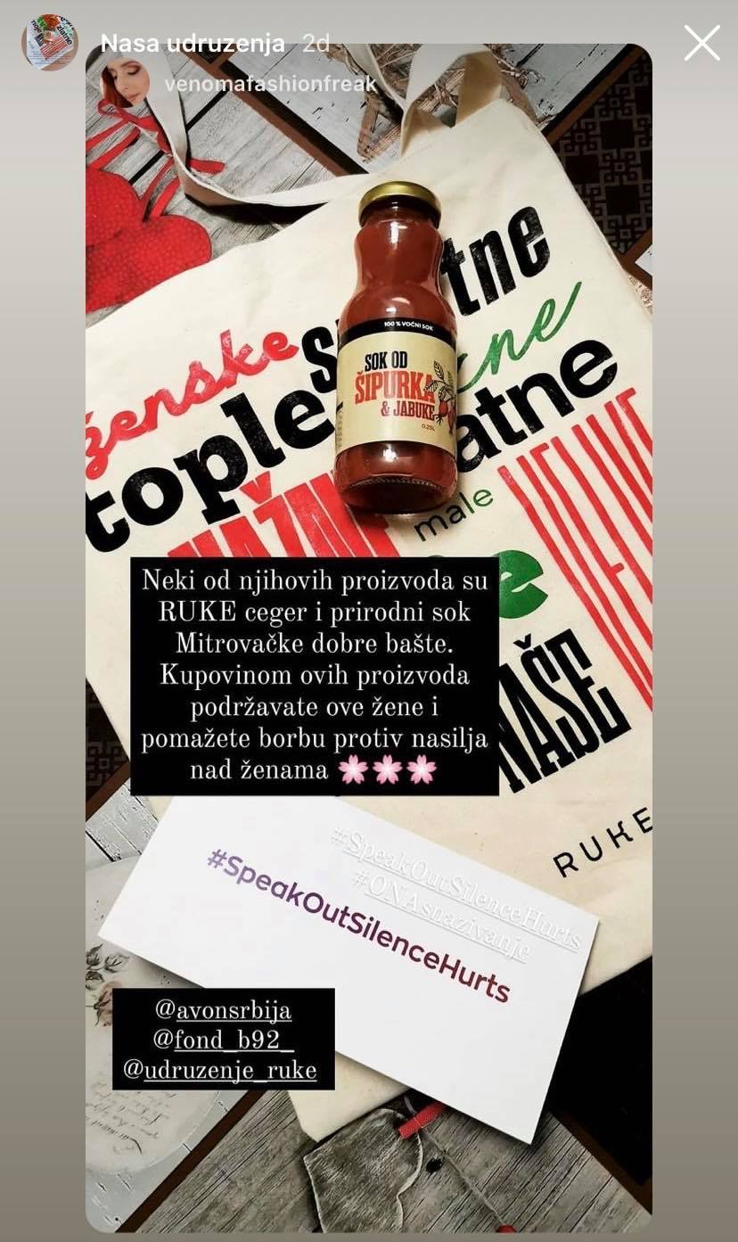 Povodom kampanje „16 dana aktivizma protiv nasilja prema ženama“, kompanija Avon Srbija je u okviru svoje inicijative „Reci NE nasilju prema ženama“ podržala ženska udruženja „Ruke“ i „Mitrovačka dobra bašta“. Podrška je realizovana putem otkupa proizvoda ovih udruženja i njihovom distribucijom na adrese čak 60 influenserki i Avon ambasadorki. Ove uticajne žene na internetu dobile su po jedan proizvod svakog udruženja – eko ceger koji prave žene okupljene oko Udruženja „Ruke“ iz Pančeva i prirodan sok od šipurka i jabuke, bez veštačkih dodataka i šećera, koji prave žene iz „Mitrovačke dobre bašte“ u Grgurevcima.